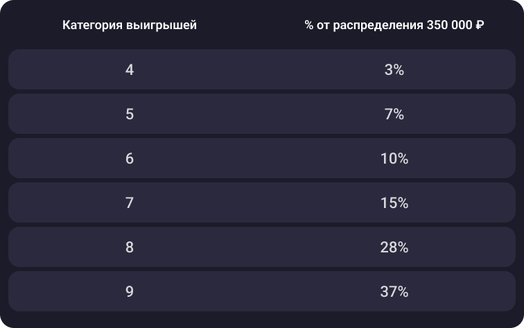 Подробнее о распределении по категориям выигрышей смотрите в таблице.
