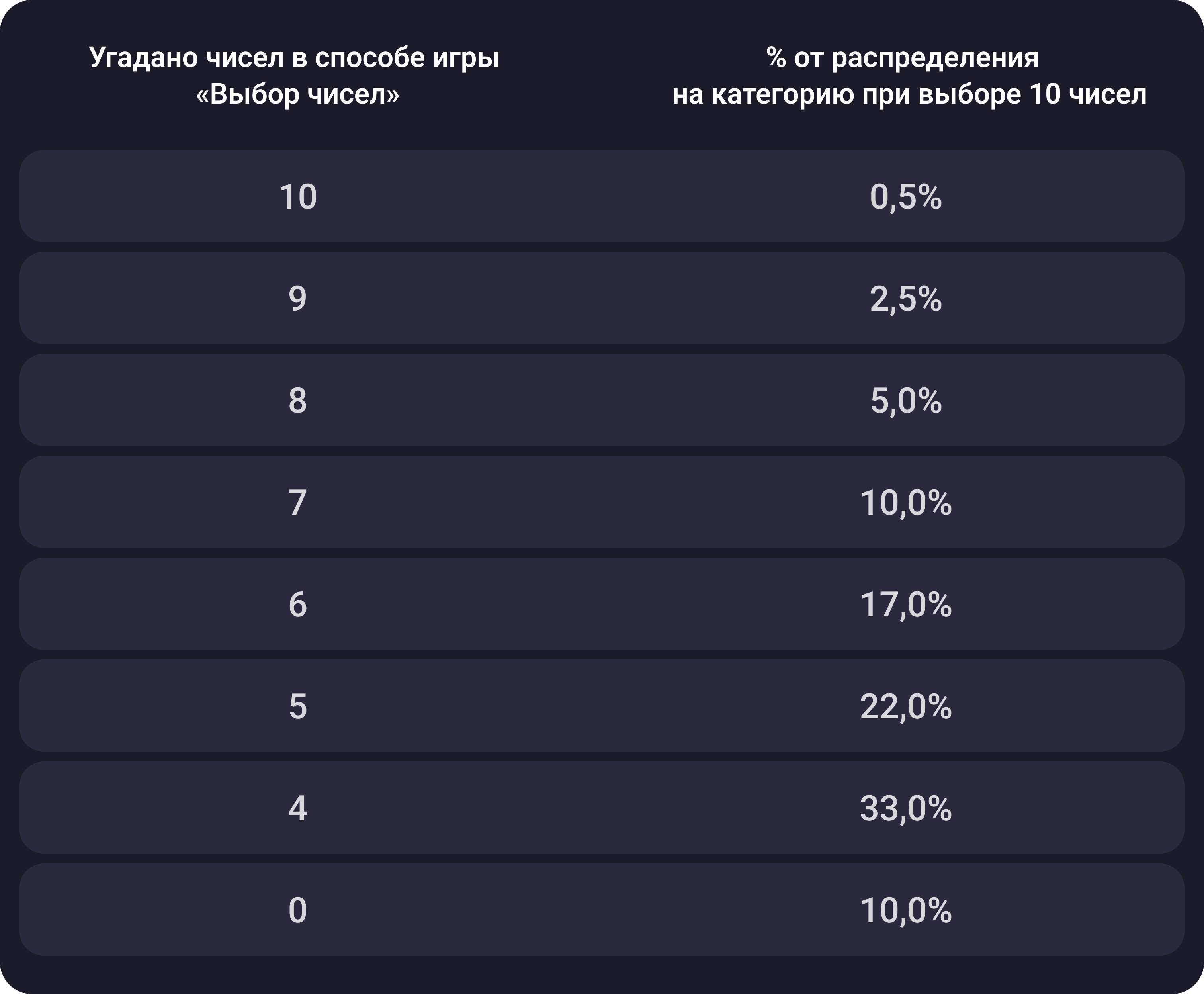 Фраза «Распределим накопленный суперприз между победителями в способе игры «Выбор чисел — 10» означает, что в тираже «ВГТЛ-1», алгоритм определения выигрышей № 1, 17.07.2025 в 21:47:30 мск между победителями способа игры «Выбор чисел — 10» будет распределен накопленный суперприз, если в тираже не будет победителей в 1-й категории.