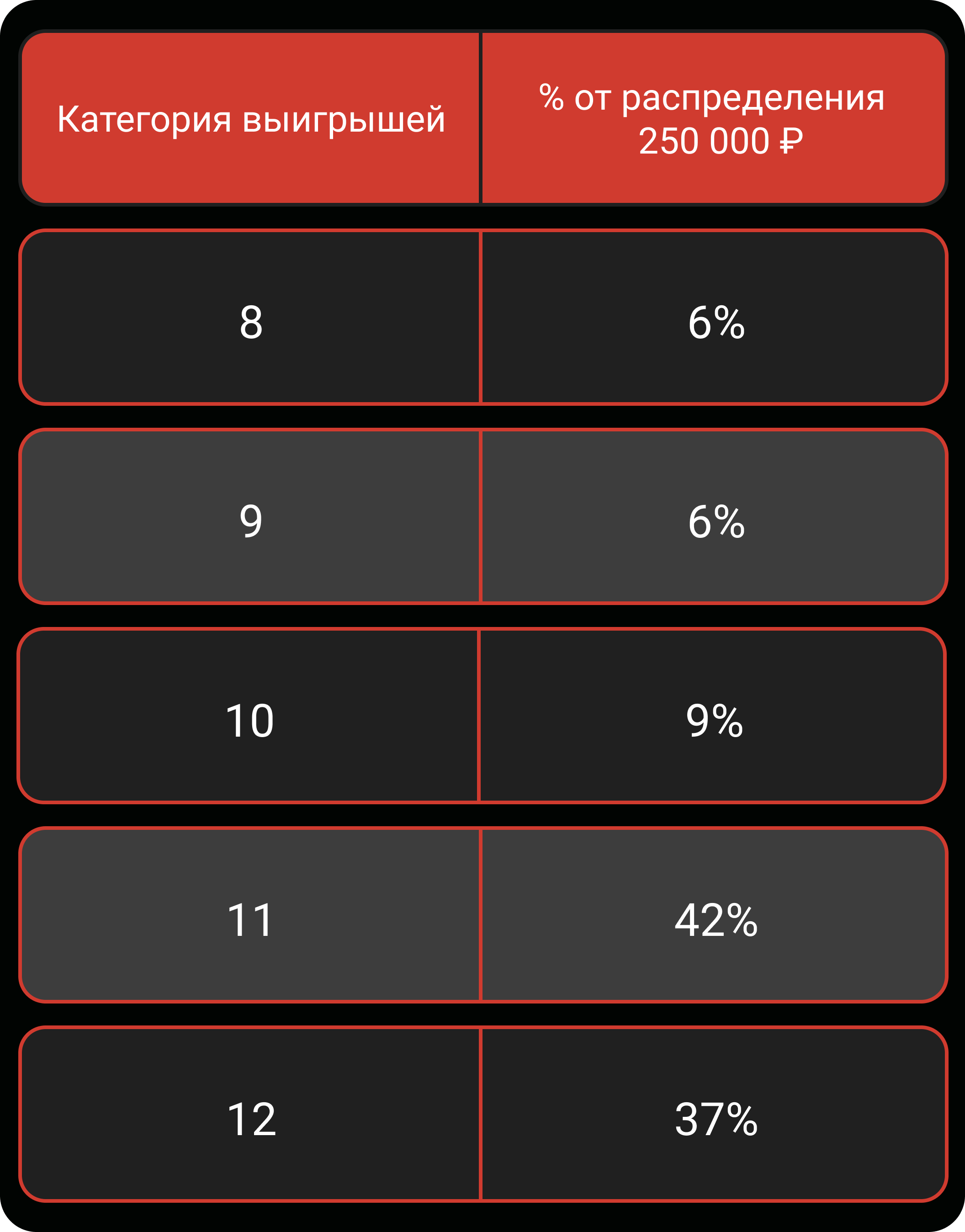 Подробнее о распределении по категориям выигрышей смотрите в таблице.