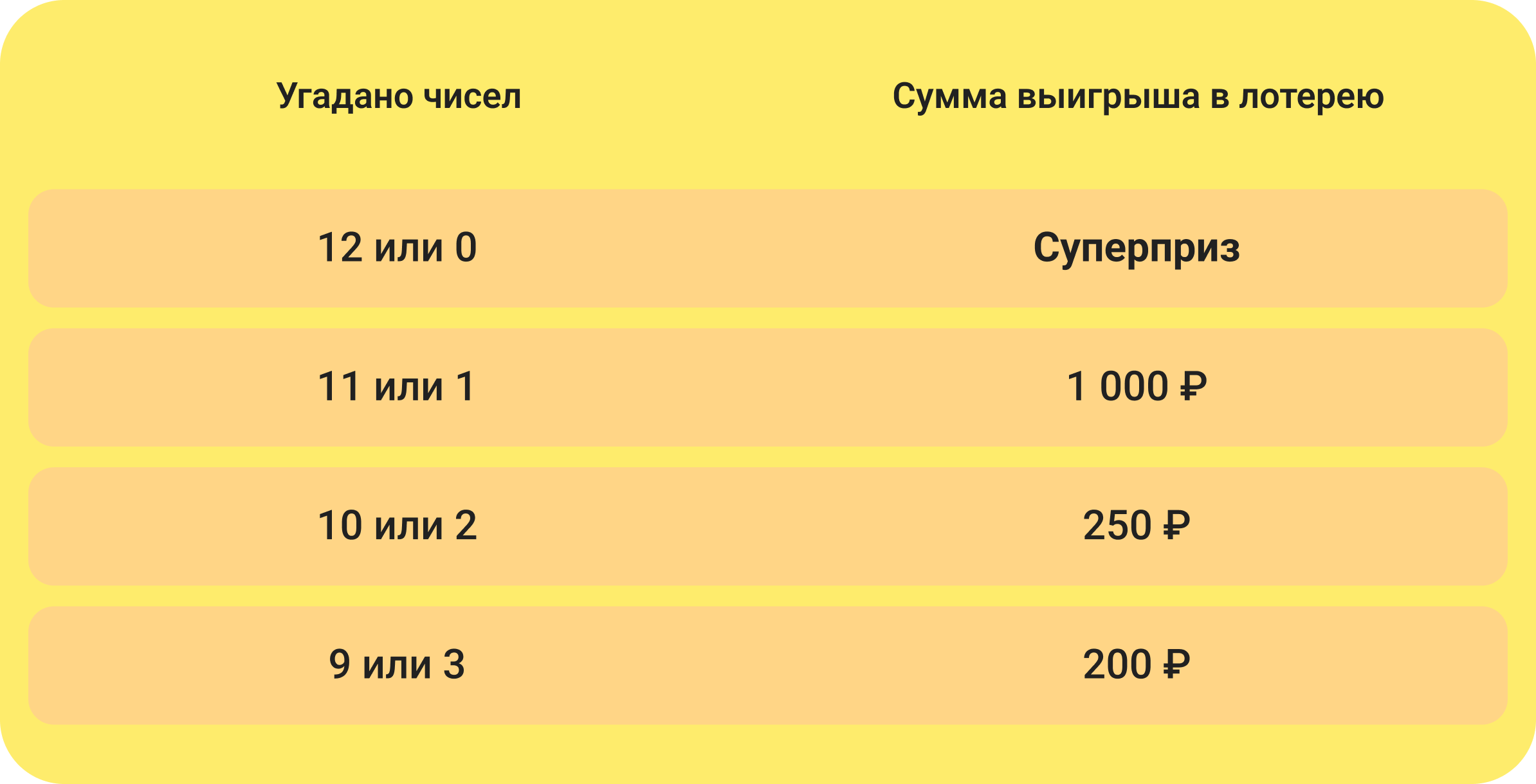 С 3 ноября в лотерее «Остатки сладки» минимальные выигрыши в 10 раз больше — от 200 ₽. Первый тираж в 10:45 мск. Акция действует до 10:15 мск 10 ноября включительно. Успейте забрать себе лучший кусочек!