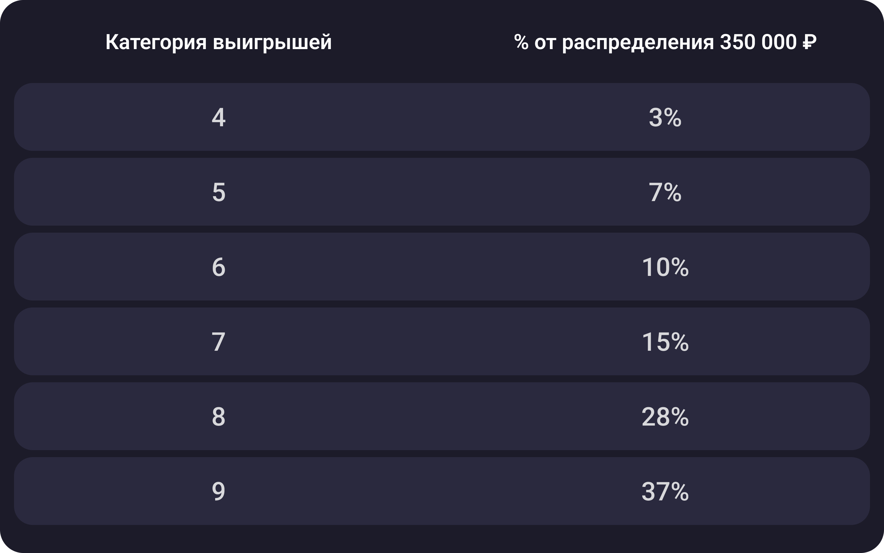 Подробнее о распределении по категориям выигрышей смотрите в таблице: