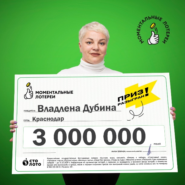 Владлена Дубина выиграла 3 млн руб. благодаря продавцу одного из краснодарских лотерейных киосков, которая предложила ей выбрать билет моментальной лотереи. Так, в буквальном смысле за считанные секунды, жительница Краснодара стала миллионером.