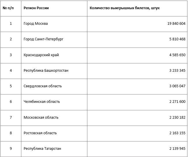 Больше всего счастливых лотерейных билетов с 1 января по 30 июня 2022 года было куплено в Москве, Санкт-Петербурге и Краснодарском крае, где традиционно жители чаще участвуют в лотереях, а значит — чаще выигрывают.