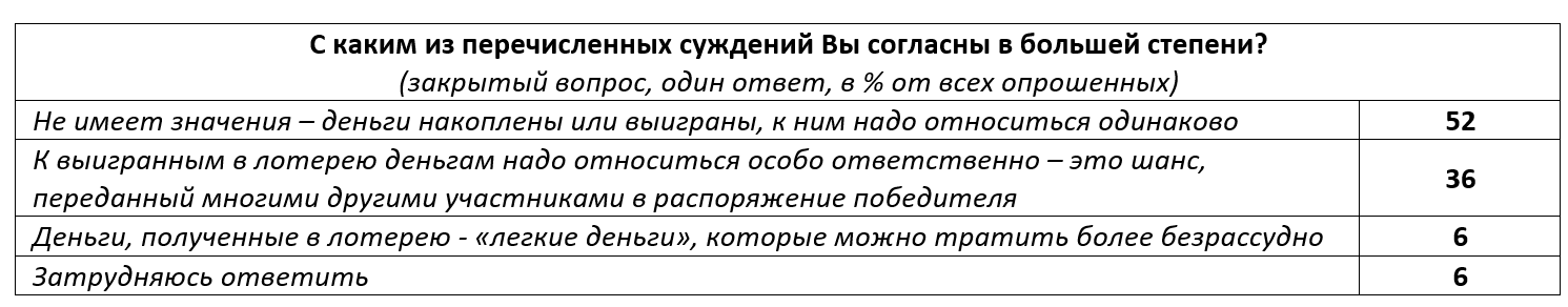 Всероссийский центр изучения общественного мнения (ВЦИОМ) представил результаты опроса, проведенного среди победителей государственных лотерей от «Столото», о том, как сложилась их судьба после крупного выигрыша. Полученные результаты позволяют сделать вывод о том, что крупный выигрыш в лотерею в первую очередь позволяет человеку повысить качество жизни и обрести бо́льшую финансовую уверенность: чем крупнее выигрыш, тем большую финансовую независимость обретает победитель. При этом даже крупный выигрыш не меняет систему ценностей победителя и его отношение к жизни в целом.