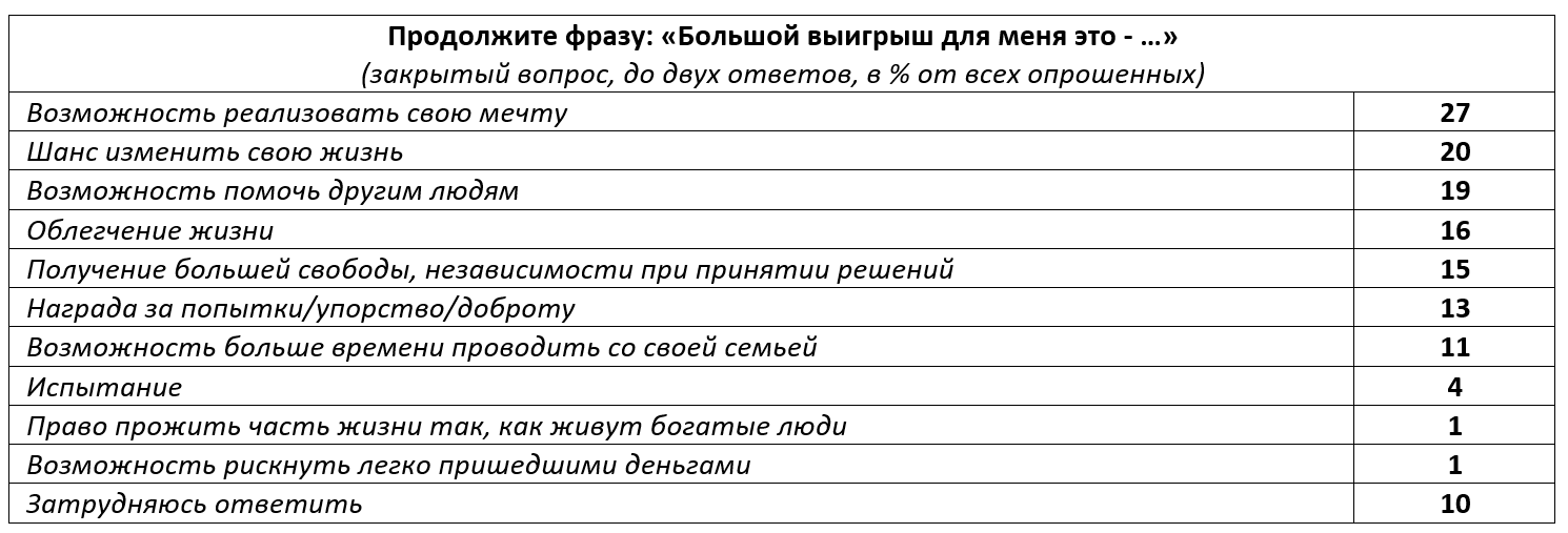 Опрос подтверждает выводы исследований, проведенных в других странах, о том, что выигрыш в лотерею в первую очередь позволяет человеку повысить качество жизни и обрести бо́льшую финансовую уверенность: