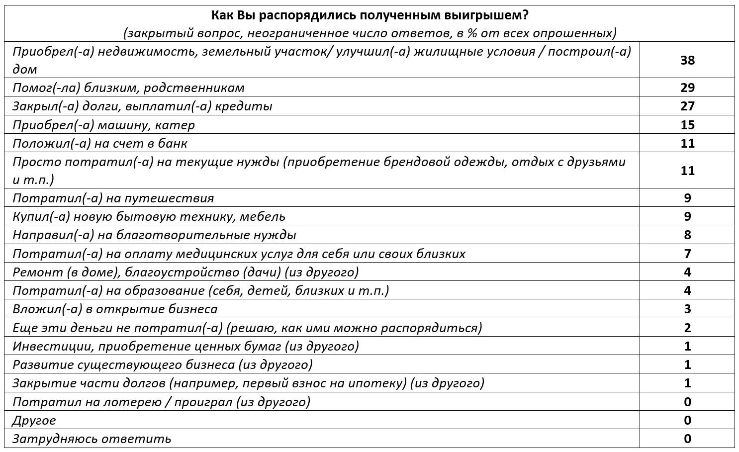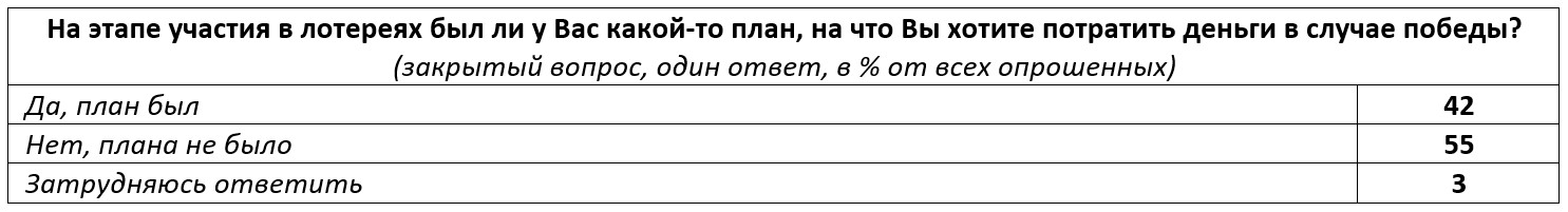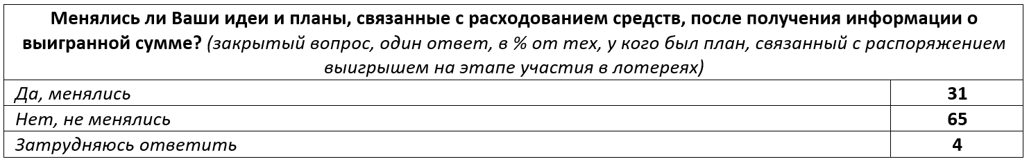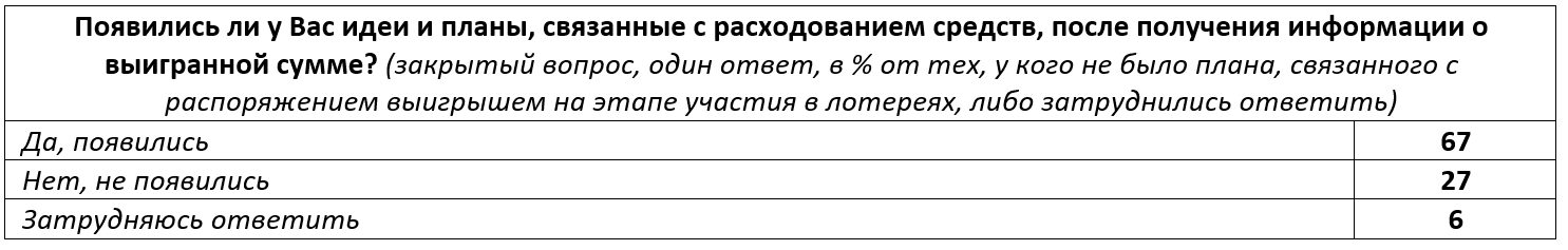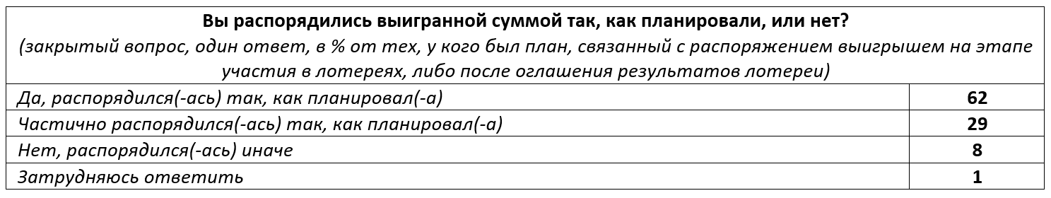 Более половины опрошенных победителей не строили планов на выигрыш на этапе участия в лотерее (55%), тогда как 42% заранее знали, на что потратят денежные средства в случае победы, причем последние в 65% случаев остались верны выбранному плану после объявления результатов лотереи. Две трети опрошенных, не строивших планов заранее (доля группы — 55%), наметили их уже после получения информации о выигранной сумме (67%). В подавляющем большинстве случаев победители отмечают, что им удалось распорядиться денежными средствами согласно ранее продуманному плану (91% от числа имевших такой план до или после оглашения результатов лотереи).