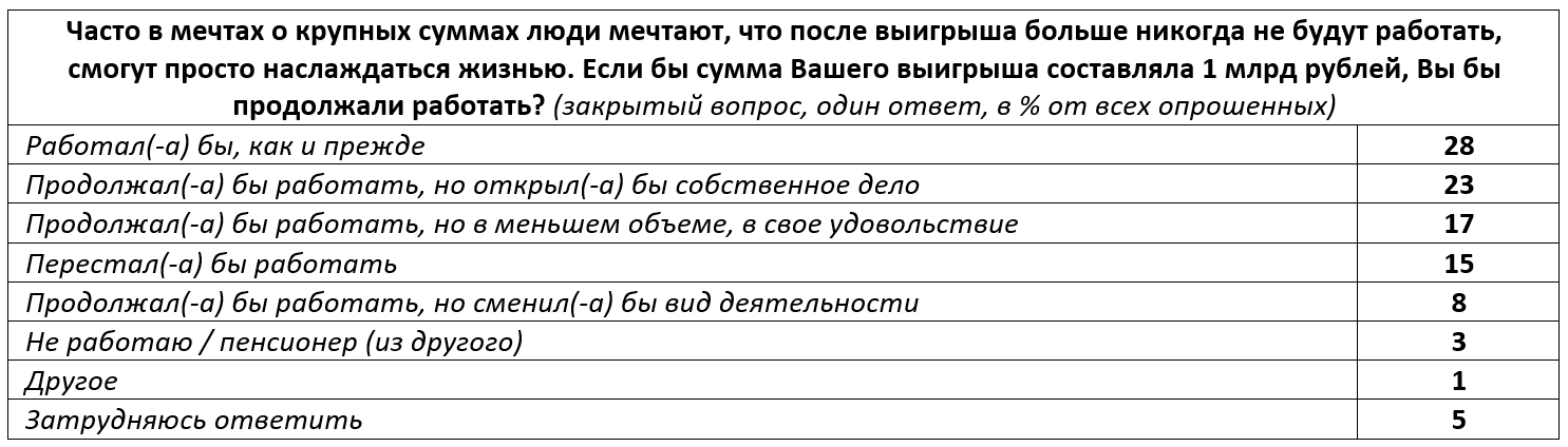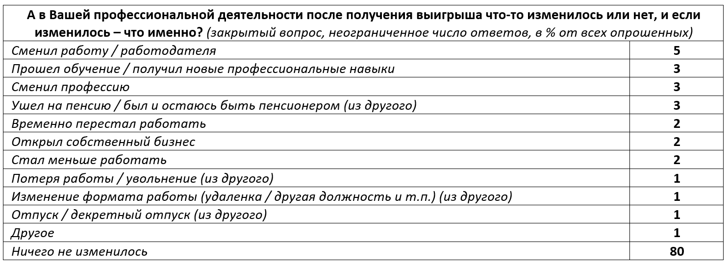 Восемь из десяти опрошенных победителей лотереи отмечают, что после получения выигрыша в их профессиональной деятельности ничего не изменилось (80%). Более того, респонденты не готовы жертвовать профессиональной самореализацией даже став лотерейным миллиардером. Большинство опрошенных ответили, что если бы сумма выигрыша составила 1 миллиард рублей, то они продолжили бы работать (76%), в том числе 28% работали бы, как и прежде, а 17% — в свое удовольствие, еще 23% открыли бы собственное дело, а 8% сменили бы вид деятельности.