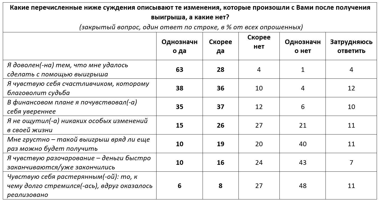 Более половины опрошенных отмечают, что после выигрыша в лотерею их жизнь улучшилась (57%), в том числе 27% сказали об этом с полной уверенностью. Об отсутствии каких-либо жизненных изменений в долгосрочной перспективе заявил 31% и практически никто не отметил ухудшений (2%).