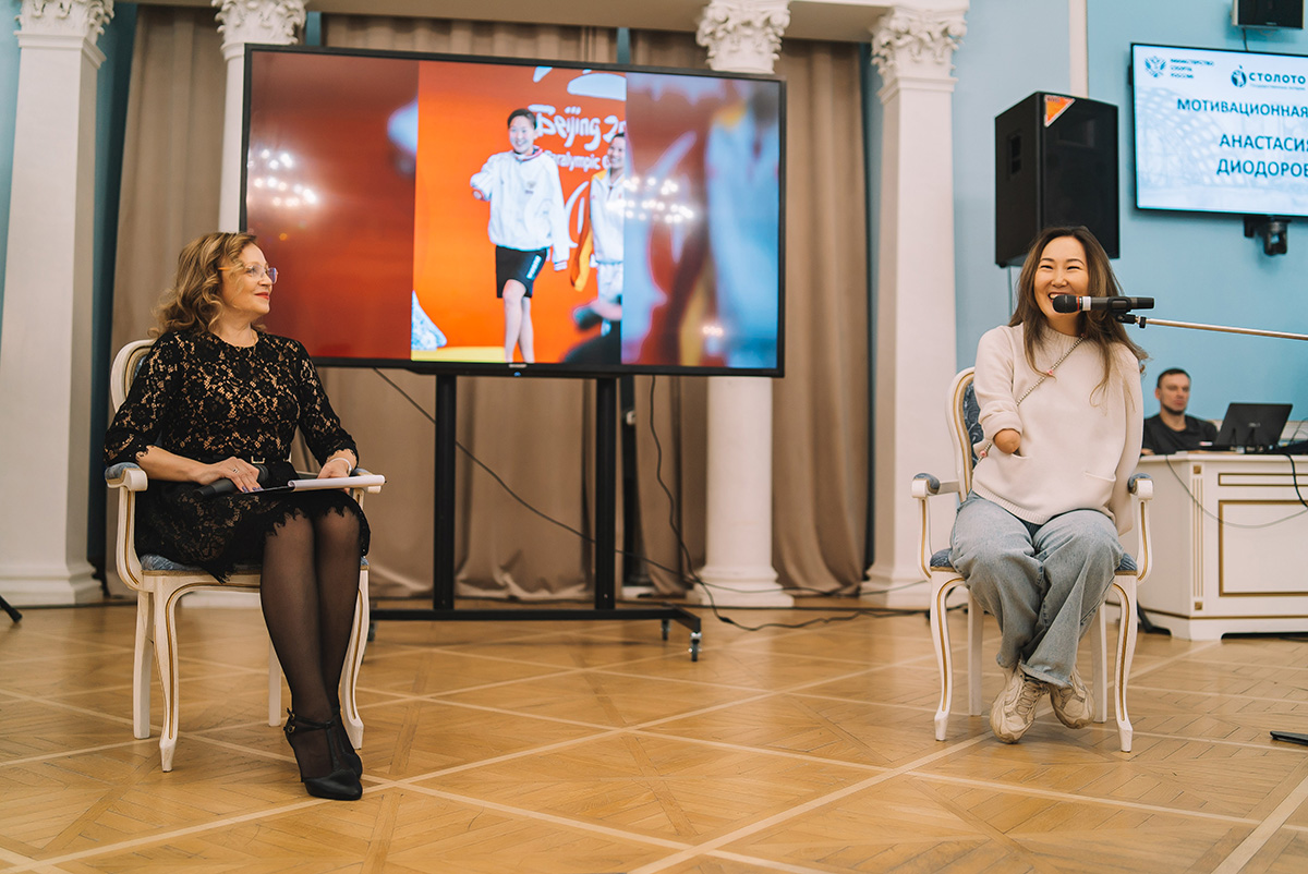 Отвечая на вопрос из зала о том, как спортсменке удавалось преодолевать волнение перед соревнованиями, Анастасия отметила важность фокусирования на маленьких шагах, которые в итоге приводят к большим результатам.